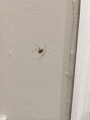 A tiny spider hangs from its silk thread in the doors frame, looking right at home.