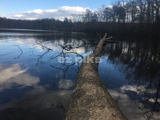 A tranquil scene of blue skies and a lone fallen tree trunk.
