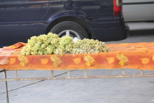 Turpan, Xinjiang, China - September 18, 2011: White grapes offered for sale by a street vendor in downtown Turpan city in Xinjiang province in northern China.