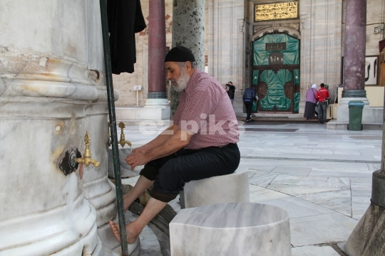 Istanbul, Turkey - 12/29/2011 : A muslim worshiper getting ready for prayer at Sultan Bayezid mosque in downtown Istanbul, Turkey.