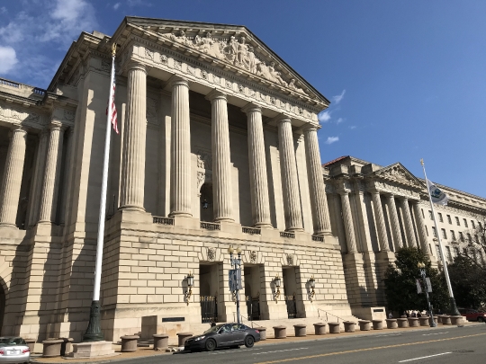 Washington DC, USA - 02-21-2018 The Andrew W. Mellon Auditorium is a historic Neoclassical auditorium located at 1301 Constitution Avenue NW in Washington, D.C. It connects the two wings of the William Jefferson Clinton Federal Building.