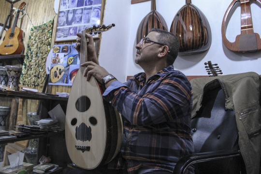 Doha, Qatar - December 29, 2013 Arabian Guitar maker Ala Jihad, adjusting the strings of one of his hand-made guitars at his workshop in Souq Waqif traditional market.