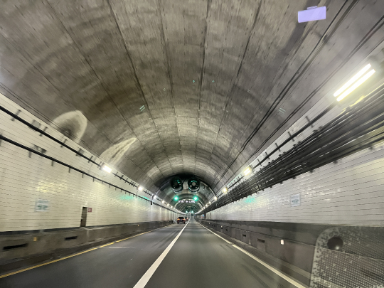 Norfolk, VA, USA - 12-29-2025 Ceilingmounted ventilation fans and road signs in Norfolks downtown underwater tunnel.
