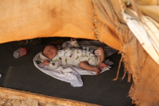 Qob Ilyas, Lebanon - 07/30/2014: A baby is sleeping inside a Syrian refugee camp in Qibb Ilyas (Qab Ilyas).