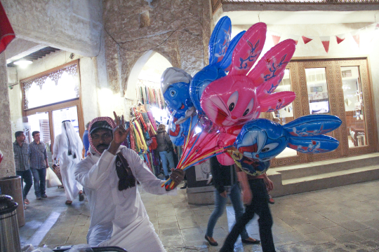 Doha, Qatar 12-29-2013 A balloon vendor in traditional attire sells colorful character balloons at Souq Waqif, a bustling marketplace in the historic center of the city.