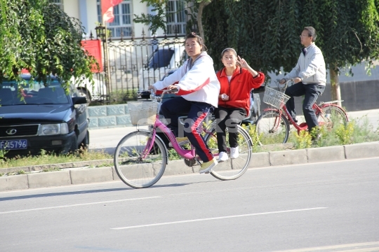 Turpan, Xinjiang, China - 09/17/2011: Two Chinese ladies bicycling.
