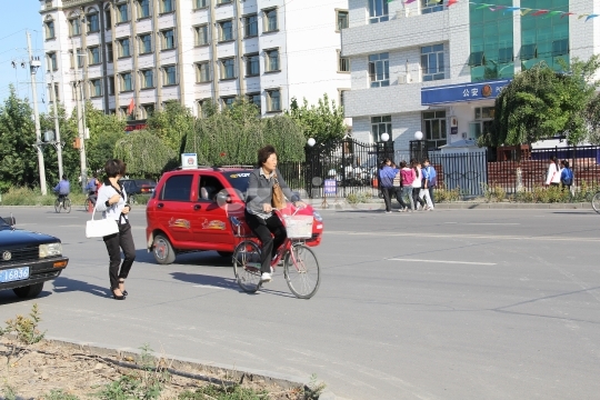 Yining, Xinjiang, China - 09-17-2011 A woman riding a bicycle on a main road in Yining city in Xinjiang province in northern China.