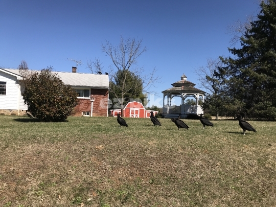 Stafford, VA, USA - 04/03/2018: Black vultures in the front yard of a house.