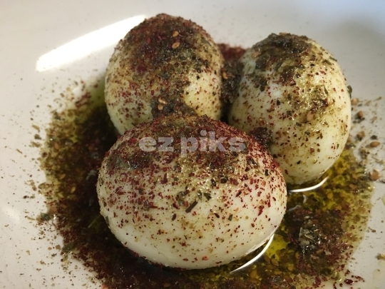 Boiled eggs with spices and olive oil, Mediterranean style.