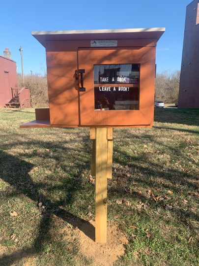 Fredericksburg, VA, USA - 05-07-2025 A wooden book exchange box sits on a post in a grassy yard under clear skies.