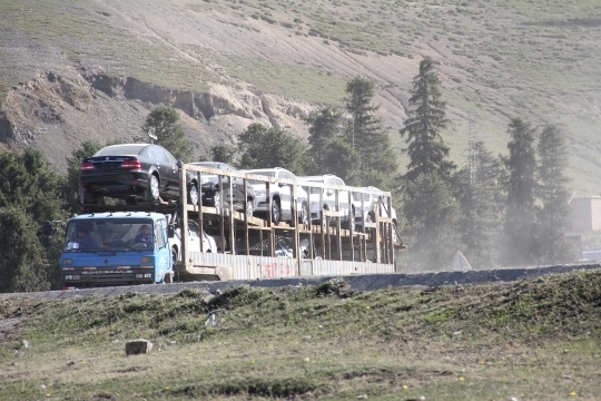 Xinjiang, China - 09-19-2011 A car carrier trailer on a mountain road in Xinjiang province, China
