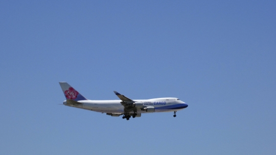 Los Angeles, Ca, USA - 07-06- 2014 A China Airlines cargo Boeing 747 Jumbo Jet releasing landing gear as it is descending for landing in Lax airport, Los Angeles, California.