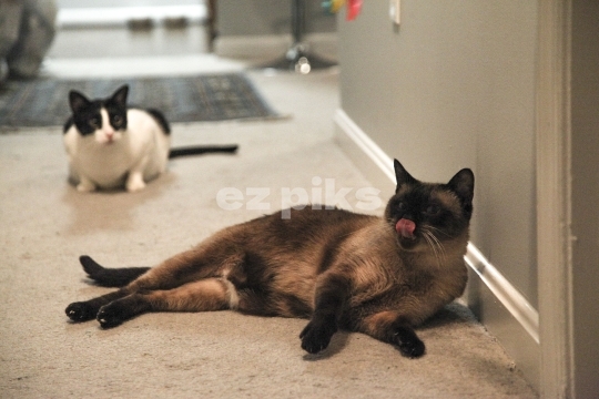 A Siamese cat sticking its tongue out; another cat in the background looking with surprise.