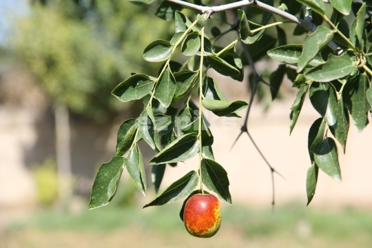 A single ripe Chinese date on its branch, ready to be harvested.