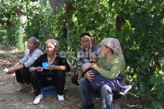 Xinjiang, China - 09/202/2011: A group of Chinese farm workers sitting in front of a vineyard, taking a break.
