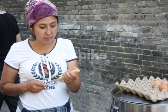 Turpan, Xinjiang, China - : A Chinese Muslim Uighur woman prepares street food.