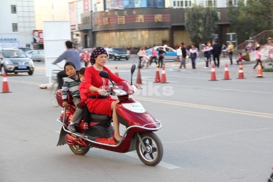 Urumqi, Xinjiang, China - 09/20/2011: A Chinese woman driving a scooter and her two children riding behind her.