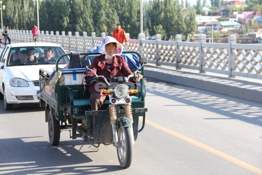 Xinjiang, China - 09/17/2011: A Chinese woman driving a work cargo tricycle on a bridge.