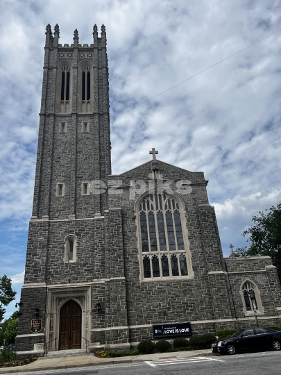 Norfolk, Virginia - 06/01/2024 : Christ and St. Luke Episcopal Church against a beautiful blue sky background. Low angle shot.