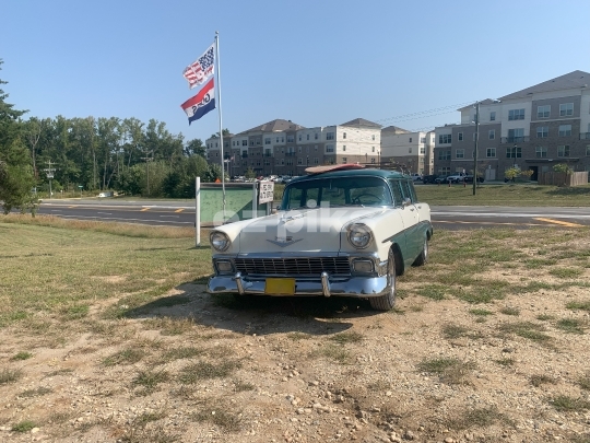 Fredericksburg, VA, USA - May 7, 2025 An American made classic car from the second half of the twentieth century with a kayak loaded on its top parked on a dirt lot.