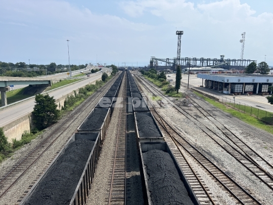 Newport News, VA, USA- 08-11-2014 Train cars loaded with coal at the coal yard in Newport News, VA, USA- high angle.