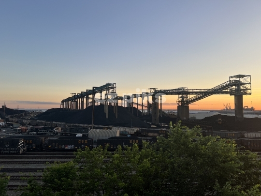 Newport News, VA, USA - 05-21-2024 Trains next to mountains of coal waiting to get loaded at a distribution terminal on James river in Virginia state, USA.