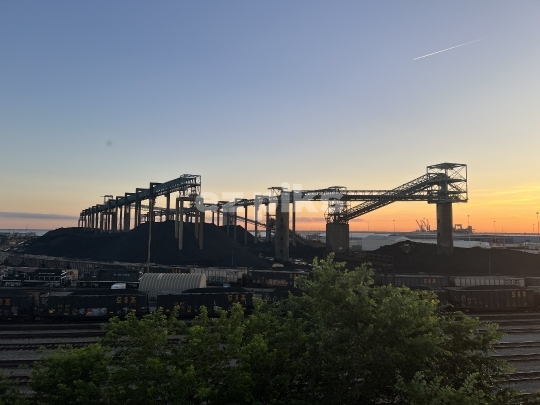 Newport News, VA, USA - 05-21-2024 Trains next to mountains of coal waiting to get loaded at a distribution terminal on James river in Virginia state, USA.