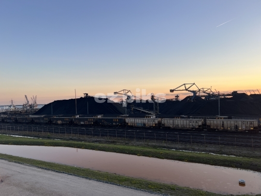 Newport News, VA, USA - 05-21-2024 Trains next to mountains of coal waiting to get loaded at a distribution terminal on James river in Virginia state, USA.