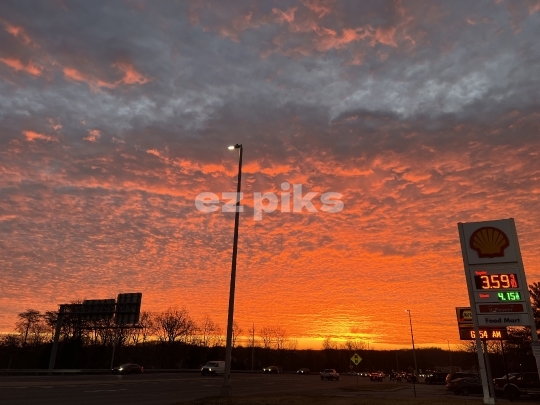 Dumfries, VA, USA- 02-25-2024 Shell gas station sign showing gas prices under Orange sky formation at dawn in downtown Dumfries, VA, USA.