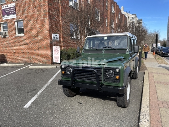 Arlington, VA, USA- 10-02-2023 An olive green classic Defender by Land Rover. Despite being produced by Land Rover for an impressive 67 years, the Land Rover Defender was discontinued in 2016.