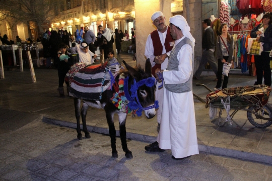 Doha, Qatar - 12-29-2013 Decorated donkey available for rent in a traditional Arabian market in downtown Doha, Qatar.
