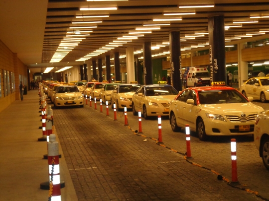 Dubai, UAE - 04-17-2012 A long line of Dubai taxi at the taxi stand in Emirates Mall in Dubai, UAE.