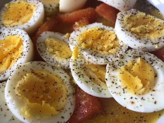 Iraqi style boiled eggs served with salt and pepper and dipped in Amba; a highly-seasoned savory dip.