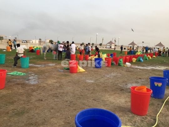 Umm Sa`id, Qatar 05-01-2015: Horses, trainers, and groomers getting ready for an endurance race