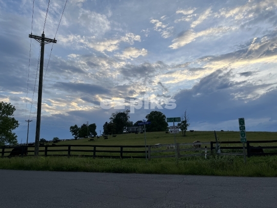 Remington, VA, USA- 06-22-2022 Heavy clouds is seen at dawn over a farm; cows grazing.