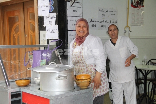 Tunis, Tunisia 02-08-2013 Two women working at a small take-out eatery smile for the camera as they prepare to serve customers in a cozy neighborhood spot.