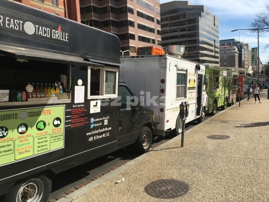 Washington DC, USA - 03/11/2016 : Food trucks lining up in downtown Washington DC, USA
