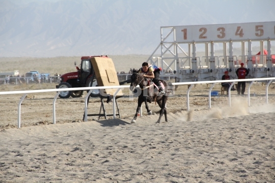 Xinjiang Province, China - 09-20-2011 Horses running in a free race on a sand track in Xinjiang province in northern China; a province that has a long history of horse breeding and horse riding.