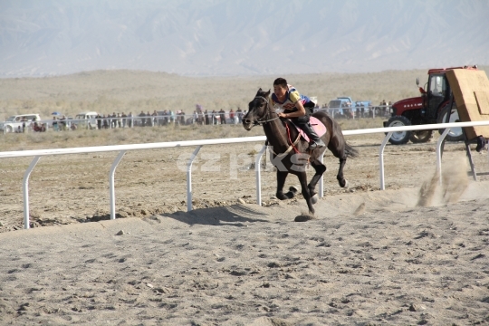 Xinjiang Province, China - 09-20-2011 Horses running in a free race on a sand track in Xinjiang province in northern China; a province that has a long history of horse breeding and horse riding.