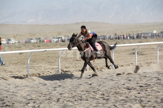Xinjiang Province, China - 09-20-2011 Horses running in a free race on a sand track in Xinjiang province in northern China; a province that has a long history of horse breeding and horse riding.