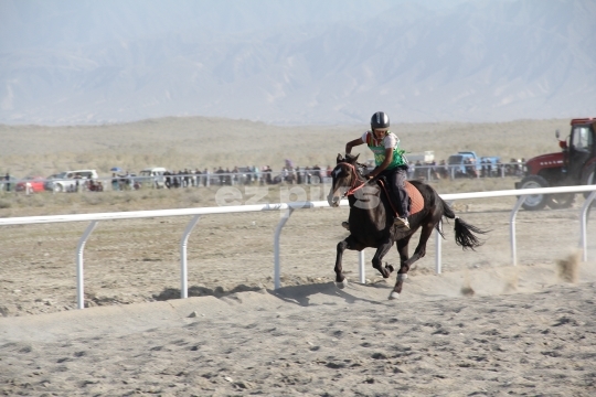 Xinjiang Province, China - 09-20-2011 Horses running in a free race on a sand track in Xinjiang province in northern China; a province that has a long history of horse breeding and horse riding.