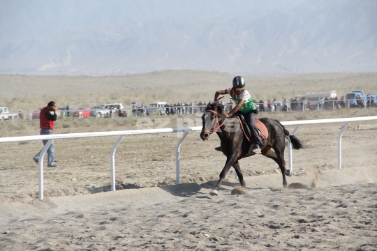 Xinjiang Province, China - 09-20-2011 Horses running in a free race on a sand track in Xinjiang province in northern China; a province that has a long history of horse breeding and horse riding.