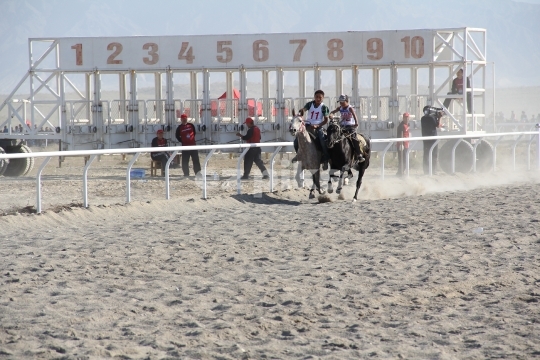 Xinjiang Province, China - 09-20-2011 Horses running in a free race on a sand track in Xinjiang province in northern China; a province that has a long history of horse breeding and horse riding.