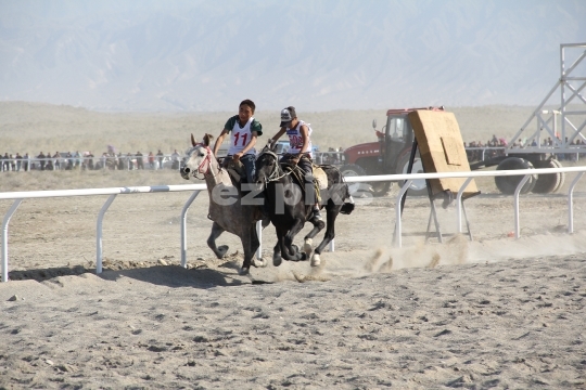 Xinjiang Province, China - 09-20-2011 Horses running in a free race on a sand track in Xinjiang province in northern China; a province that has a long history of horse breeding and horse riding.