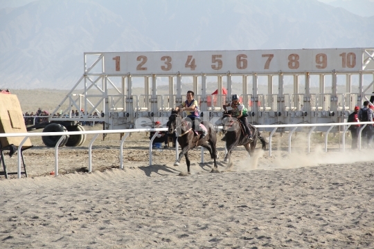 Xinjiang Province, China - 09-20-2011 Horses running in a free race on a sand track in Xinjiang province in northern China; a province that has a long history of horse breeding and horse riding.
