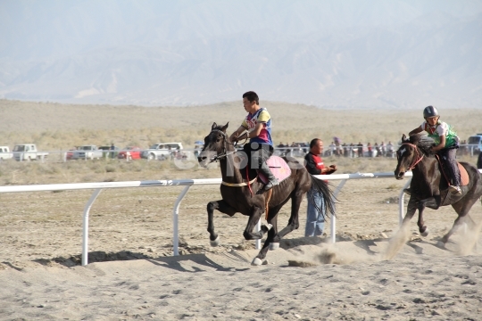 Xinjiang Province, China - 09-20-2011 Horses running in a free race on a sand track in Xinjiang province in northern China; a province that has a long history of horse breeding and horse riding.