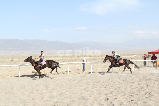 Xinjiang Province, China - 09-20-2011 Horses running in a free race on a sand track in Xinjiang province in northern China; a province that has a long history of horse breeding and horse riding.
