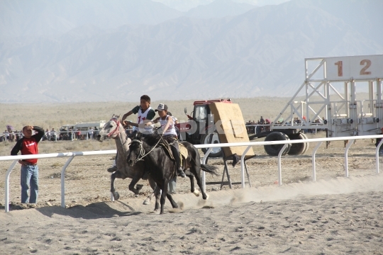 Xinjiang Province, China - 09-20-2011 Horses running in a free race on a sand track in Xinjiang province in northern China; a province that has a long history of horse breeding and horse riding.