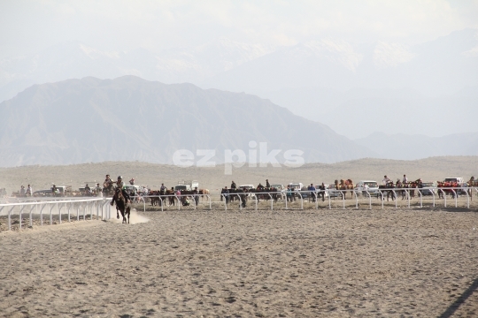 Xinjiang Province, China - 09-20-2011 Horses running in a free race on a sand track in Xinjiang province in northern China; a province that has a long history of horse breeding and horse riding.