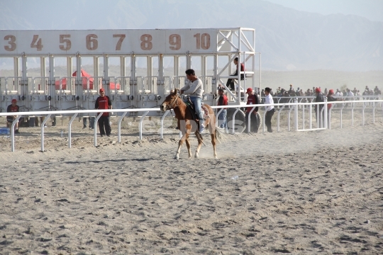 Xinjiang Province, China - 09-20-2011 Horses running in a free race on a sand track in Xinjiang province in northern China; a province that has a long history of horse breeding and horse riding.